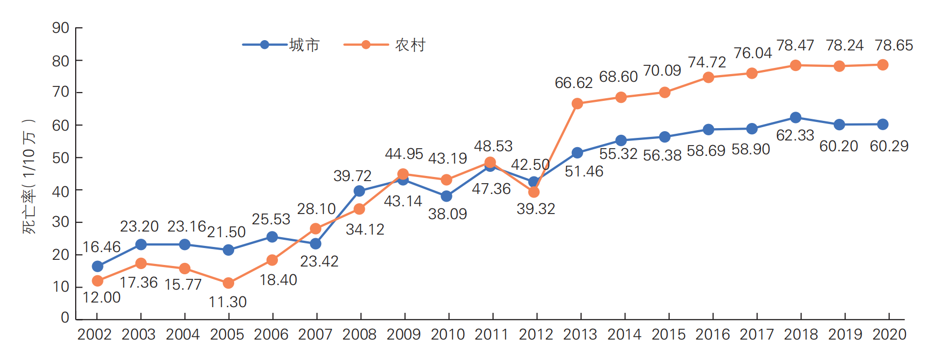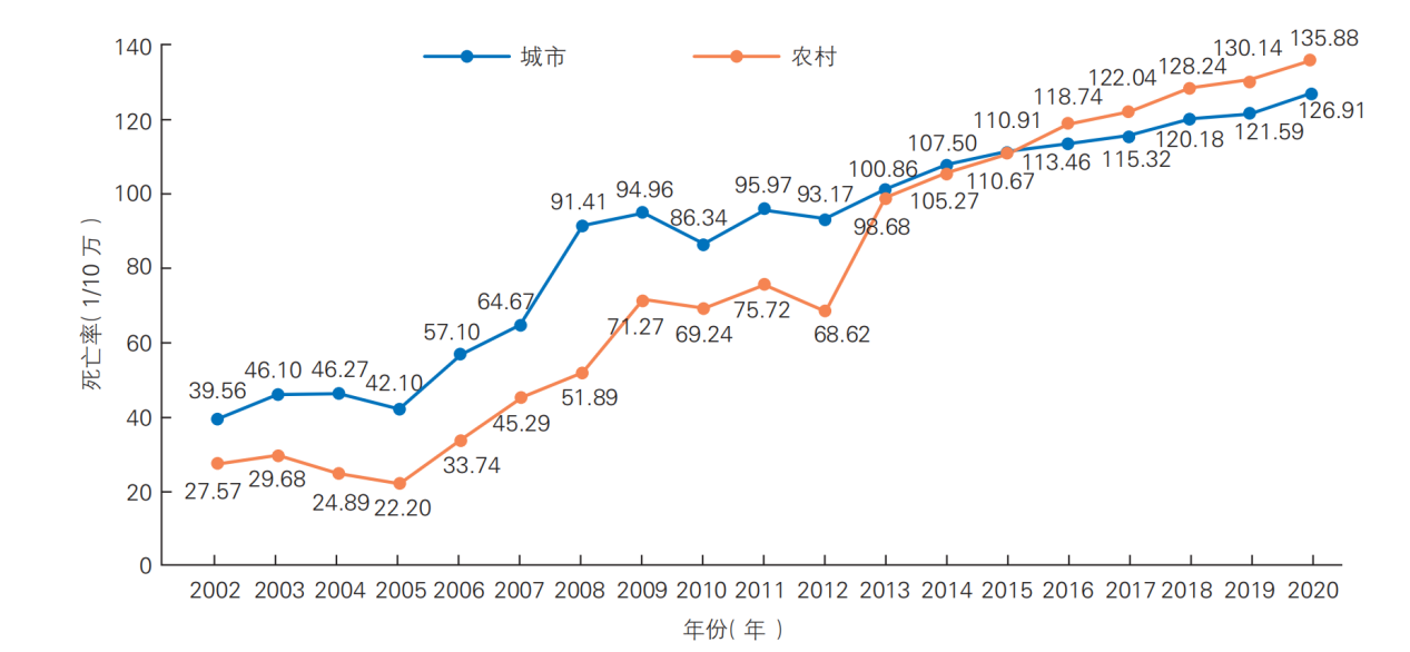 2002~2020 年中国城乡居民冠心病死亡率变化趋势